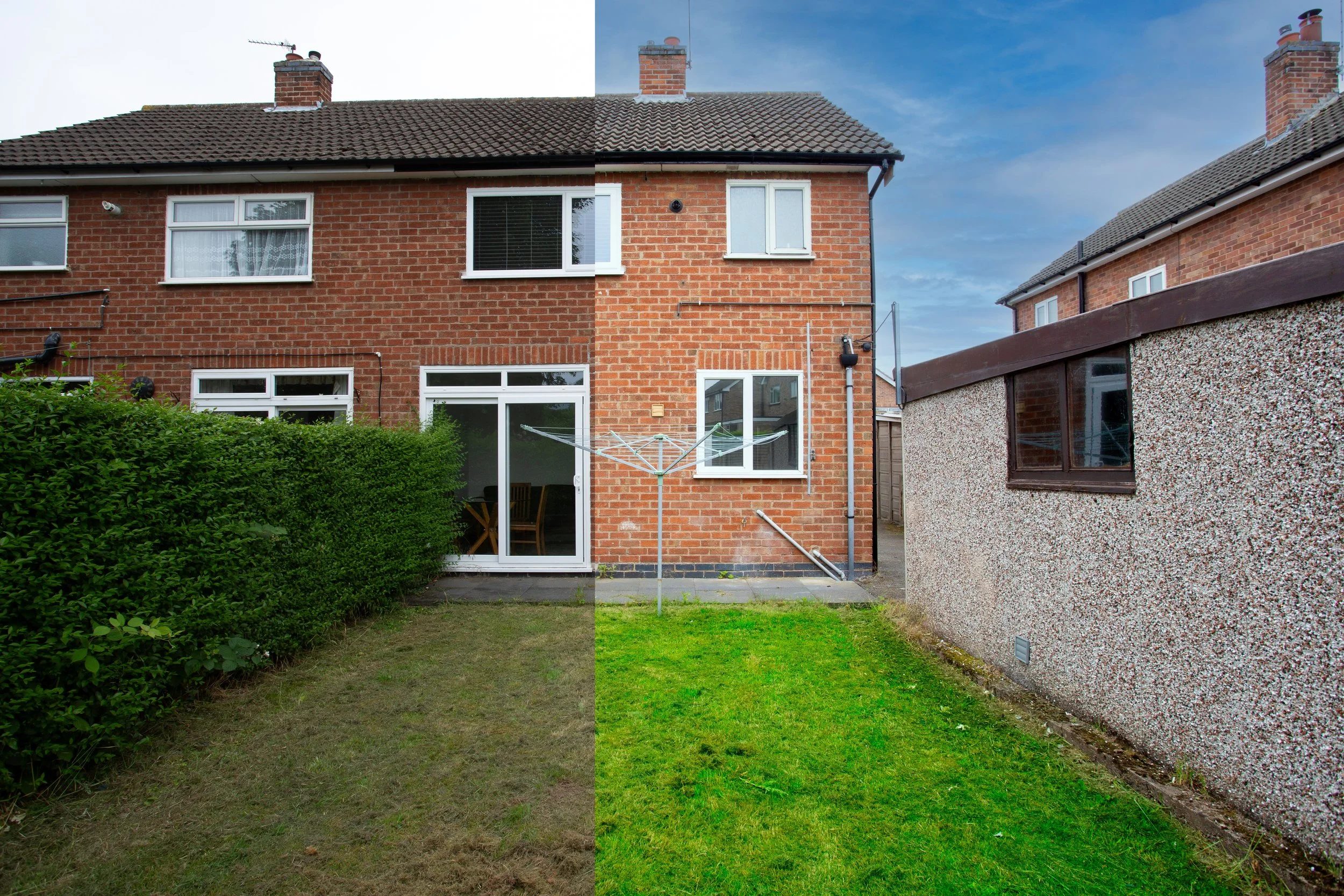 If grass has died from a drought or has ice on it, this can be made more appealing by adding an adjustment layer on photoshop and painting over the grass with a suitable green colour and using a soft light blend mode. Whether this shows potential or is a false representation of the property is up to you!